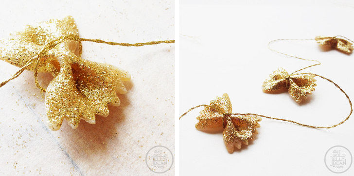 Не пошкодуйте їх і при створенні власних новорічних прикрас. Навіть макарони-метелики з-за блискучого покриття перестають бути схожими самі на себе і стають відмінною прикрасою. Та й дітям безумовно сподобається подібне перетворення.