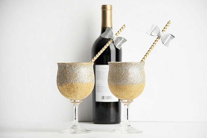 Блискітками, крім іншого, можна прикрасити пляшки з напоями, столові прилади, тарілки та келихи. Чому ні? У таке свято їх багато не буває!