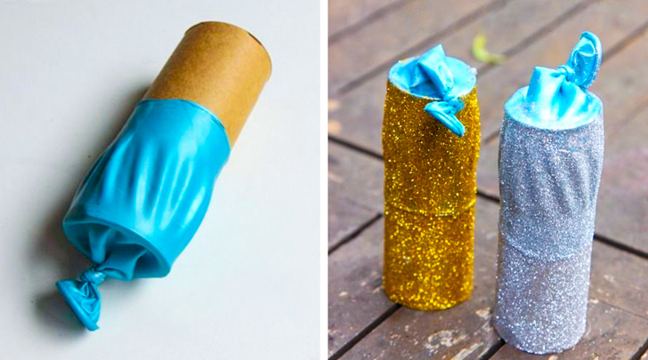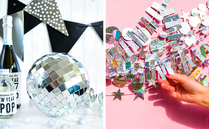 Блискучі, сяючі, глянцеві атрибути — невід'ємна частина новорічних свят. Тому не шкодуйте блиску для прикраси будинку. На фото вище представлений варіант саморобної новорічної хлопавки, яка, окрім барвистого наповнення, сама по собі виглядає сліпуче. Як зробити такі самостійно, ви можете подивитися тут.
