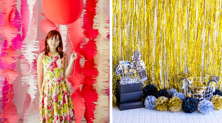 І організувати це досить просто: для фону можна використовувати дощик, мішуру, гірлянди з паперової бахроми, кулі (диско або повітряні) і все, що душі завгодно. А до підлоги можна прикріпити композицію з фейкових (і не тільки) подарунків або облаштувати сидячі місця для більшої варіативності позування.