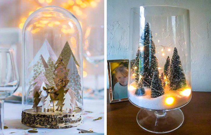Або є варіант, що ідеально підходить для спільної творчості з дітьми: хто не пам'ятає популярний різдвяний сувенір у вигляді скляної кулі з штучним снігом і різноманітними фігурками? Таку красу можна зробити своїми руками, причому для цього не обов'язково використовувати вакуумну колбочку. Можна як раз таки пустити в хід великі вази з широким горлечком, а замість того, щоб шукати штучний сніг, насипати дрібну або велику сіль, яка є на кухні майже у кожного.