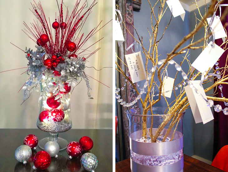 Картинка вище ліворуч являє собою традиційний варіант: при наявності новорічної атрибутики у вигляді гілочок, мішури, гірлянд та іграшок можна створити яскраву композицію для прикраси столу. Картинка праворуч — приклад своєрідного дерева бажань: це відмінний спосіб налаштувати думки гостей і рідних на позитивний лад, запропонувавши їм задуматися і записати на листку свої бажання і цілі, які згодом прикріплюються до дерева і залишаються там як нагадування.
