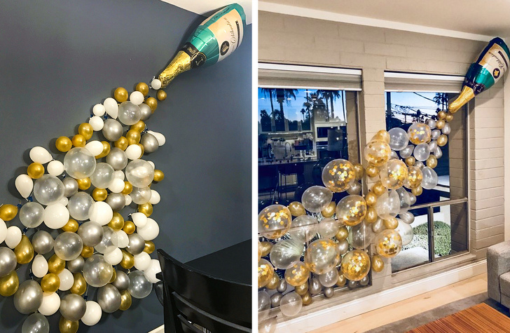 Всупереч розхожій думці, прикраса у вигляді повітряних кульок підходить не тільки для святкування весілля або дня народження. Доказ тому — приклад вище: оригінально і дуже привабливо.