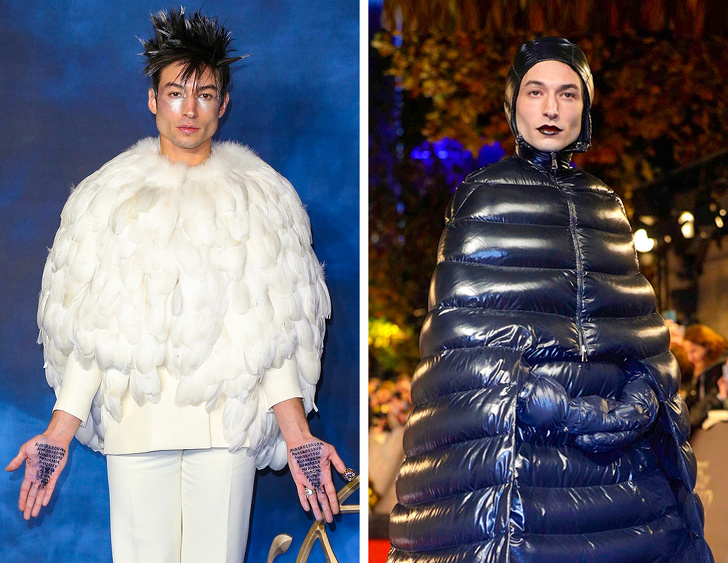 На прем'єрних показах фільму «Фантастичні тварини: Злочини Грін-де-Вальда» молодий чоловік вразив публіку двома нарядами: перший був з білого пір'я (схоже, Езра зображував Буклю, улюблену сову Гаррі Поттера), другий наряд, чорний, — то величезний пуховик, то спальний мішок. А може, це звичайна одяг мешканців тієї далекої планети, звідки Езра Міллер прилетів до нас, простим землянам?