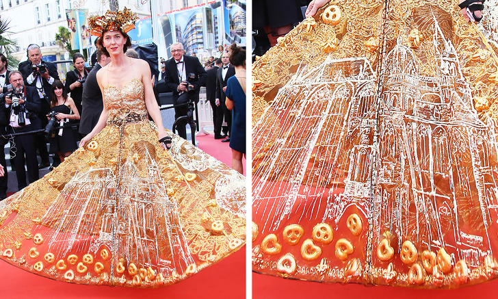 Гостей Каннського кінофестивалю важко здивувати незвичайним вбранням, але російському дизайнерові Ларисі Кац це вдалося. Вона постала перед публікою у власноруч створеному платті, прикрашеному... печеньками! Такий наряд виглядає не тільки досить екстравагантно, але ще досить апетитно. У минулі роки Лариса також запам'яталася каннському суспільству нарядами зі сміття і цукеркових фантиків.