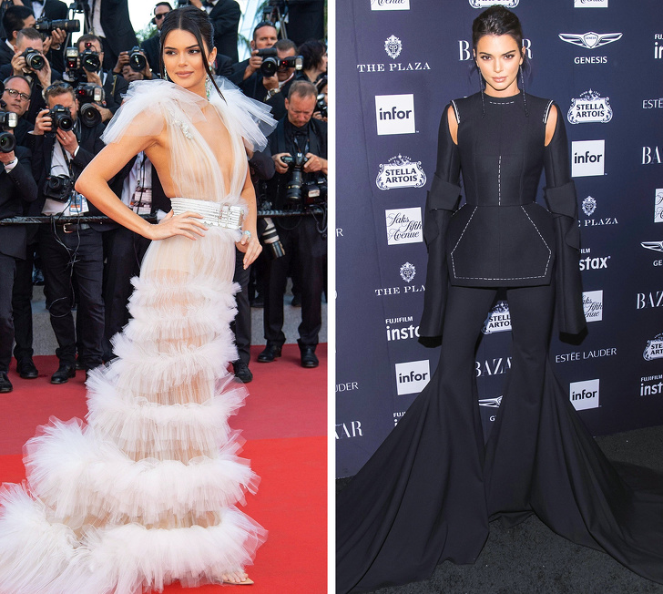 На червоній доріжці Каннського кінофестивалю Кендалл Дженнер блищала в дуже відвертому і одночасно ніжному білому прозорому платті, чим викликала фурор серед публіки. Ще один дуже незвичайний наряд Кендалл в цьому році — чорний брючний костюм з супердлинными штанинами і рукавами. Ви б змогли пройтися в таких незручних нарядах і не впасти, заплутавшись в тканини? Кендалл змогла, на те вона і супермодель.