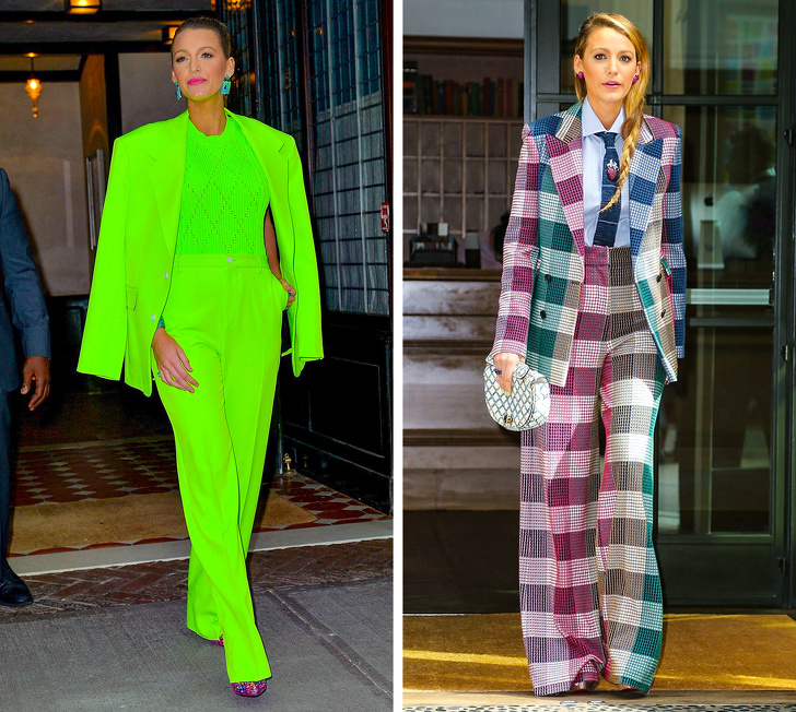 Два брючних костюма Блейк Лайвлі в цьому році привернули особливу увагу громадськості і породили величезну кількість жартів і мемів. Виявилося, що неоново-зелений наряд Блейк взято з чоловічої колекції бренду Versace. А костюм в клітину сама Блейк жартома порівняла зі скатертиною для пікніка, після чого фоловерів в коментарях порадили їй звільнити свого стиліста. Актриса не розгубилася і відповіла на критику дуже дотепно: «Я багато разів намагалася звільнити свого стиліста, цю нікчемну Блейк Лайвлі, але вона весь час повертається назад». Виявилося, що дівчина сама собі стиліст і воліє носити те, що їй самій подобається, на зло всім недоброзичливцям.
