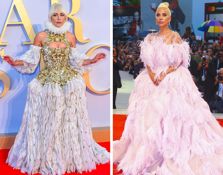 Леді Гага давно не шокує публіку нарядами з сирого м'яса, її стиль останнім часом став більш стриманим і вишуканим. І все ж образи співачки звичайними і нудними ніяк не назвеш. Ми насилу змогли обрати кілька найбільш пам'ятних суконь з тих, в яких Леді Гага блищала на прем'єри мюзиклу «Зірка народилася». Наряд співачки на першому знімку виконаний у вікторіанському стилі, вона схожа на горду королеву, а на другому Леді Гага ніби пливе в рожевому хмарі з пір'я.