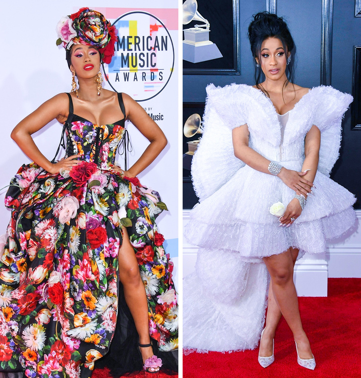 Популярна американська хіп-хоп-виконавець Карді Бі обожнює яскраві вбрання. На церемонії вручення музичної премії American Music Awards вона з'явилася в образі квіткової феї, а в білій сукні на церемонії «Греммі» була схожа на зухвалого ангела.