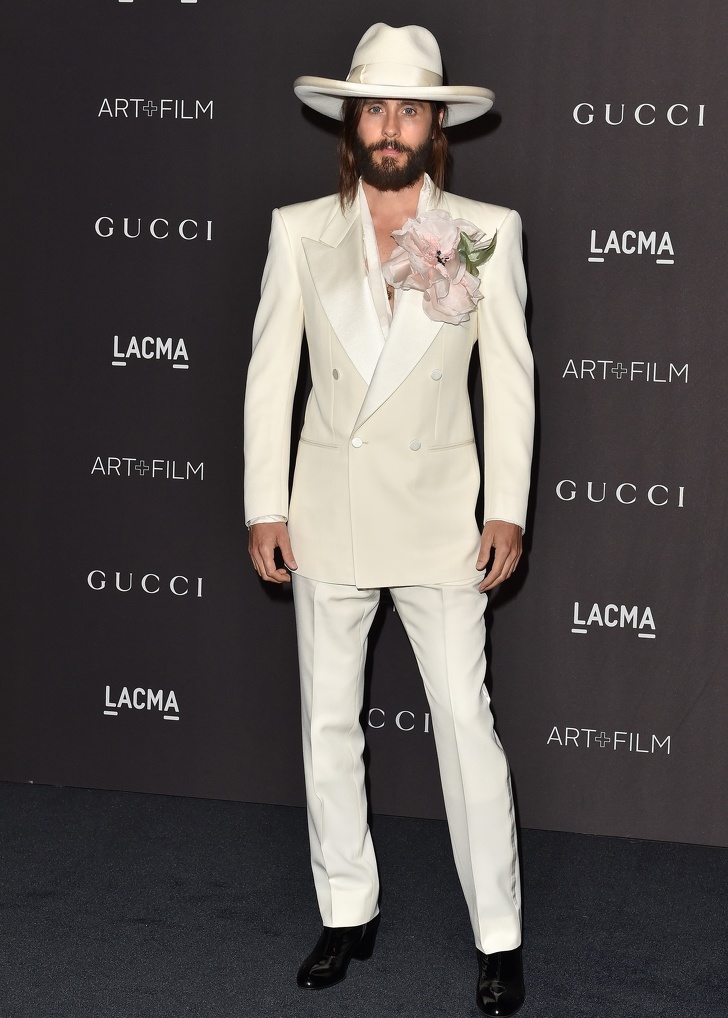 Актор і музикант Джаред Літо воліє загадкові і романтичні образи. Білий костюм з рожевою квіткою, ідеальна зовнішність — Джаред в такому вигляді сильно скидався б на нареченого ляльки Барбі, Кена, але капелюх все змінила. Поспішаємо зняти перед Джаредом свій капелюх: цей наряд від Gucci демонструє його витончений смак.