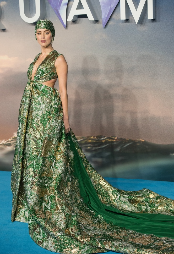 Фатальна красуня Ембер Херд на листопадовій прем'єрі фільму «Аквамен» вразила всіх: шикарне смарагдово-зелене плаття, ніби виткане з морських водоростей, було доповнено не вечірньою зачіскою, а незвичайним головним убором, що нагадує шапочку для плавання в басейні (хоча і дуже вишукану). Але ж Ембер в цьому фільмі як раз грає «володарку морську» Міру, тому що такий наряд цілком виправданий.