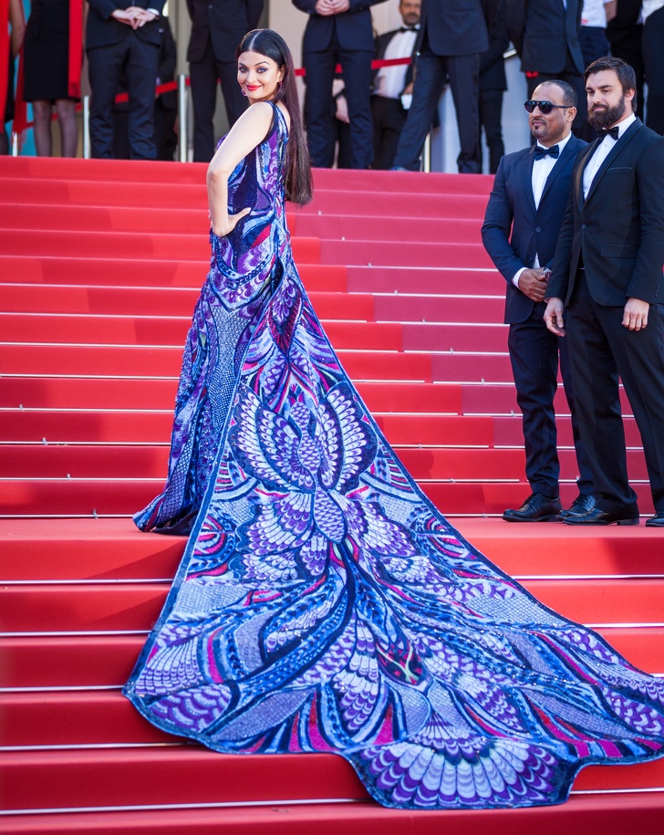 Айшварія Рай Баччан давно є загальновизнаною королевою червоної доріжки на Каннському кінофестивалі, але в цьому році вона перевершила саму себе. Актриса одягла вишукане плаття дубайського дизайнера Майкла Сінко, повністю розшита кристалами Swarovski. Нам здалося, що довгий шлейф дуже схожий на хвіст розкішної екзотичної птиці, але, за словами дизайнера, він імітує «метелика, що з'являється з лялечки». На створення сукні пішло близько 3 тис. годин.