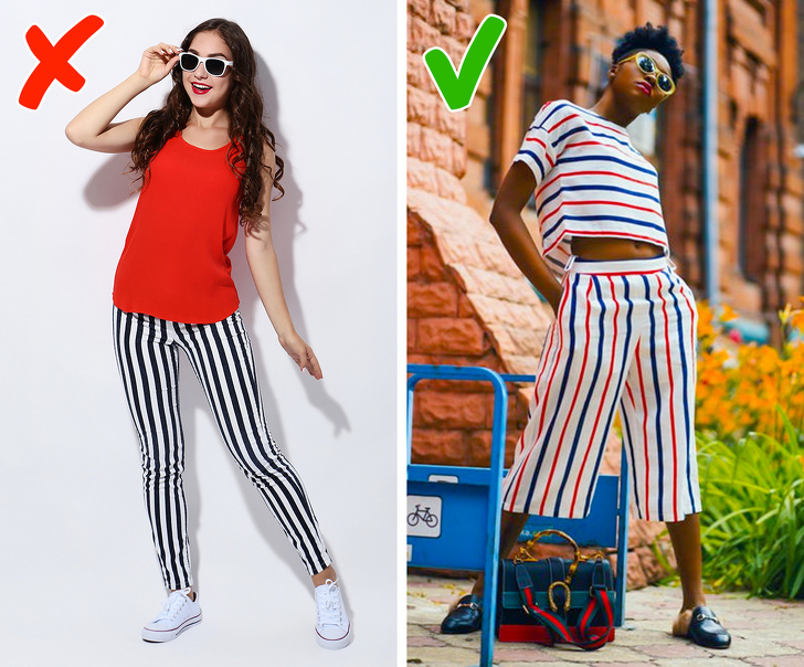 Така модель підійде тільки дуже худеньким дівчатам, та й то із застереженнями. Широкі стегна або гомілки будуть виглядати ще ширше, а будь-яке недосконалість форми ніг стане дуже помітним. Залиште смужку для більш вільних моделей, а облягаючі брюки краще вибирати більш спокійних кольорах.