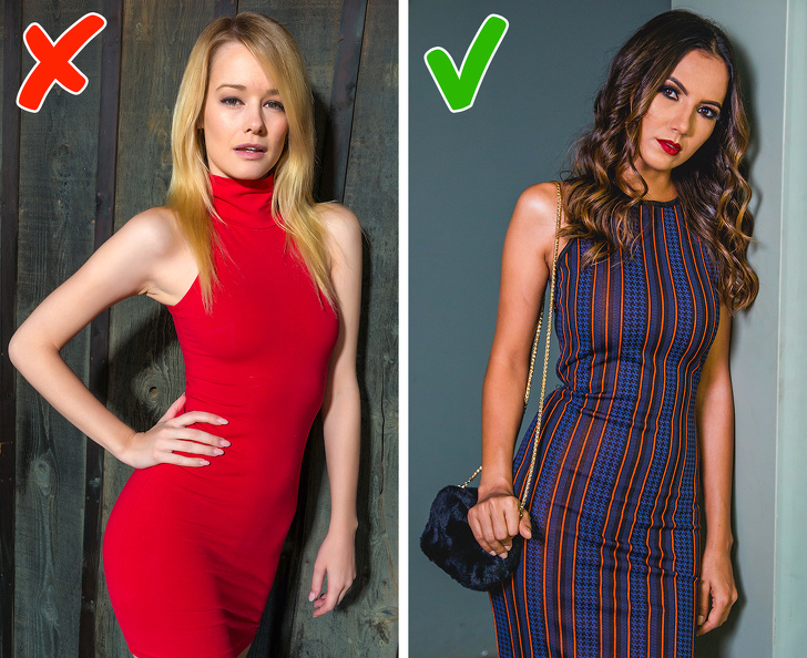 Випробування тонким трикотажем не витримує практично жодна фігура, так як цей матеріал робить явним все: зайві складки на талії, тазові кістки і нижню білизну. Облягаючі сукні і топи краще вибирати з більш щільної тканини, а речі з тонкого трикотажу — більш вільного крою.