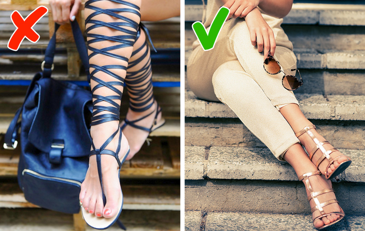 Сандалі-гладіатори чи створюють ефект «олівця в склянці», або перетягують ногу, що виглядає неестетично. До того ж довжина до коліна — не кращий вибір для літнього гардеробу. Більш вдалим вибором стануть акуратні босоніжки з ремінцями, що охоплюють щиколотки, або еспадрільї.