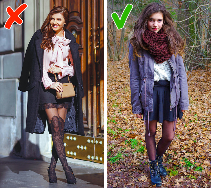 Колготки — це той випадок, коли грати краще з кольорами, а не з текстурою. Ажурні панчохи і колготки в сітку можуть виглядати досить непогано, але тільки в тематичних образах в стилі панк-рок або глем-рок. А ось з діловою одягом або нарядами в стилі casual вони не поєднуються і виглядають вульгарно. Однотонні колготки більш універсальні і добре вписуються в будь-який наряд.