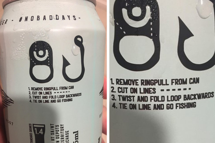 «1. Зніміть кільце з банки. 2. Розріжте по лініях. 3. Скрутіть і складіть металеве кільце. 4. Прив'яжіть до волосіні і йдіть на риболовлю».