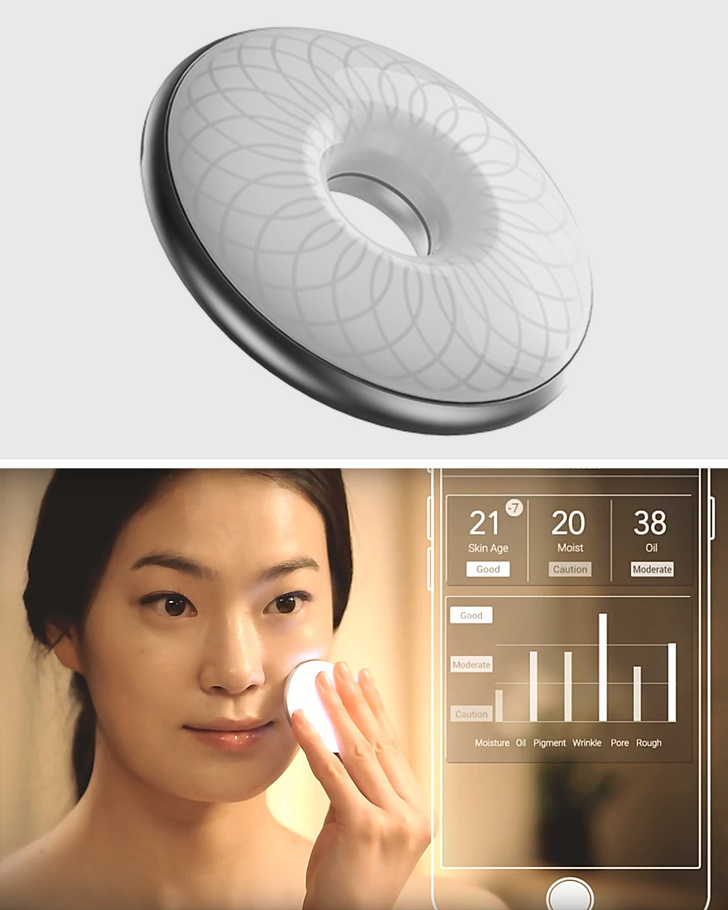 Маленький бублик, який вміє аналізувати стан шкіри (зволоженість, жирність, пігментацію та ін), відслідковувати умови навколишнього середовища і давати корисні рекомендації по догляду в додатку. Пристрій важить 23,5 м, а заряд здатне тримати більше тижня.