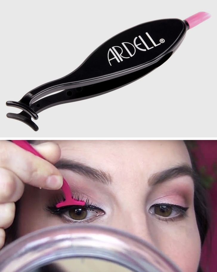 Здавалося б, що складного в тому, щоб закріпити накладні вії? Насправді руками або звичайним пінцетом не так вже і зручно акуратно поєднувати лінію і фіксувати вії на столітті. Але й для цієї операції є зручне пристосування. Щипчиками спеціального аплікатора потрібно помістити смужку з віями на повіку, а силіконовим наконечником з іншого боку приклеїти основу.