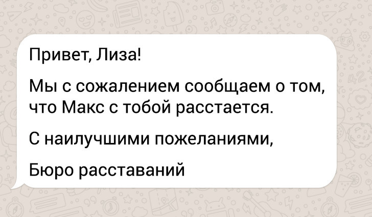 На тлі появи нових способів знайомства в мережі і в реальному житті компанія The Breakup Shop придумала, як заробити в кризу, і не прогадала. Новітній сервіс допомагає швидко розлучитися зі своєю другою половинкою, тим, хто занадто зайнятий, соромиться або не хоче зробити боляче своєму екс-коханому / коханій.