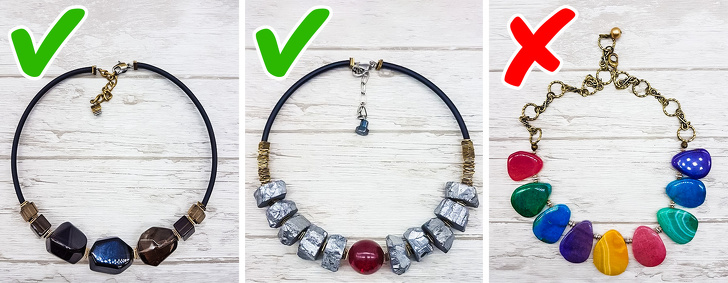 Сьогодні модно міксувати різні текстури, кольори та матеріали. Обов'язкова умова — вони повинні поєднуватися один з одним. Наприклад, можна зупинити увагу на наборі з різних по товщині і відтінку шкіряних браслетів, комплекті ланцюжків одного стилю. А ось золотий ланцюжок поруч з шкірою і пластиком буде виглядати дивно. Пластмасові кольє, намиста краще носити окремо один від одного. У великій кількості вони виглядають дешево.