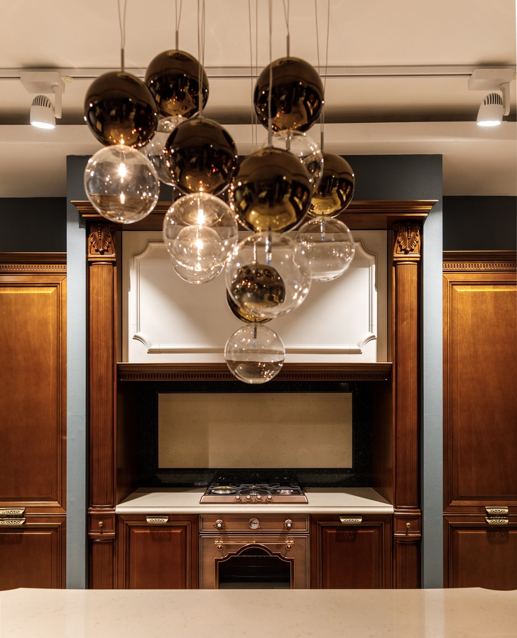 Стильна декорована люстра, безумовно, створює акцент в інтер'єрі, особливо коли вона приспущена зі стелі і знаходиться на рівні інших речей в кімнаті. Але це на 100 % провальне рішення для кухні, якщо тільки щоденне змивання крапель жиру і води з плафонів не входить в список ваших улюблених занять.