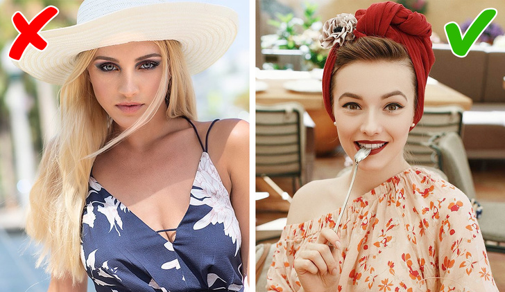 Висока кепі додасть трохи зростання, панама — легковажність, а тюрбан зробить ваш образ більш загадковим. Не бійтеся пробувати різні види головних уборів, щоб дізнатися, який з них найбільше підходить саме вам. Але важливо пам'ятати, що вони повинні поєднуватися з іншим нарядам і формою обличчя. Наприклад, крислатий капелюх не підходить жінкам з трикутним обличчям: вона візуально розширює його, «зводячи очі до центру, і підкреслює форму носа, яка може бути неідеальними.