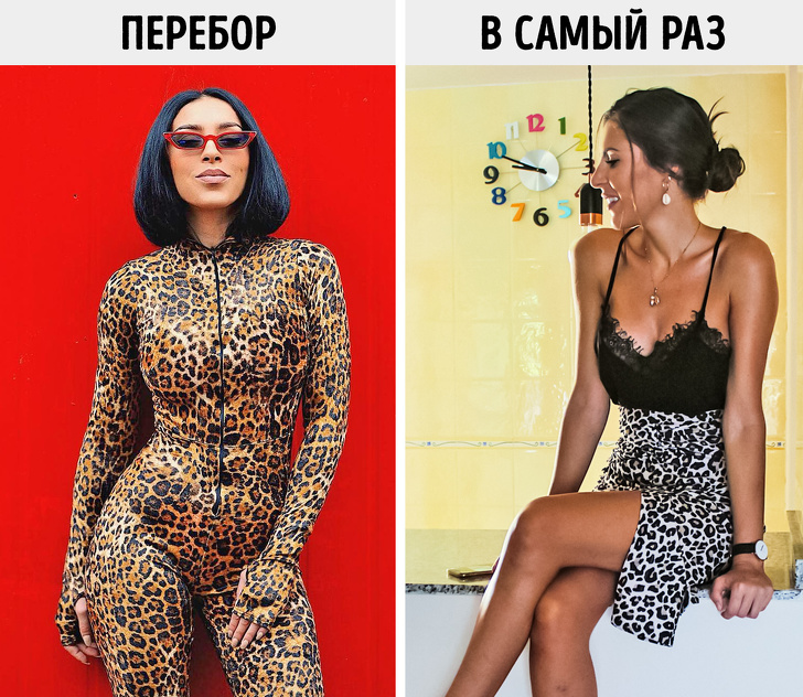 Найчастіше гармонійний і стильний комплект одягу виходить, якщо в ньому тільки одна річ з анімалістичним принтом. Також пам'ятайте, що цей візерунок сам по собі дуже зухвалий. З ним не потрібно додатково підкреслювати фігуру супероблегающим фасоном, прозорими вставками або міні-спідницею, інакше вийде вульгарний, а не красивий образ.