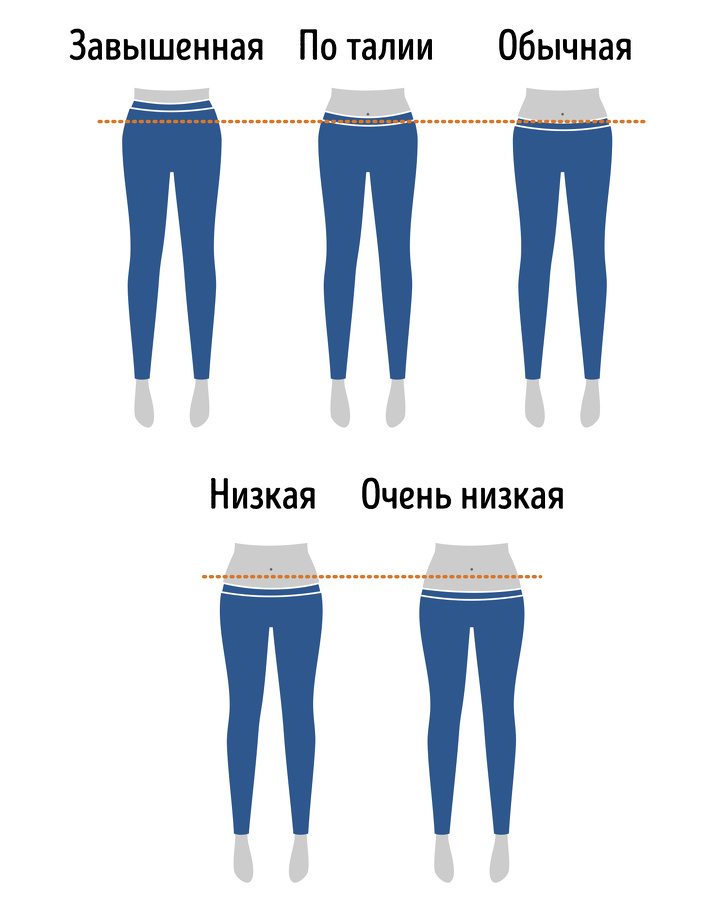 - По талії (original). Така посадка мало чим відрізняється від завищеної — верхня лінія поясу тут проходить на рівні пупка. Носити їх можна і треба з тими ж речами, що й джинси high-wasted: восени і ранньою весною їх ідеально доповнять заправлені фланелеві сорочки, пуловери і светри, влітку — кроп-топи, легкі блузи і класичні білі сорочки.
