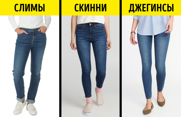 - Джегинсы (jeggings). Як зрозуміло з назви, джегинсы — це якийсь гібрид джинсів і легінсів, а значить, вони обтягують тіло ще більше, ніж скінні. З моменту своєї появи на подіумах у 2010 році джегинсы не виходять з моди, принаймні любов дівчат до них як і раніше велика. При правильно підібраному кольору на їх основі можна створювати як ділові, так і вуличні образи. Вибираючи джегинсы, потрібно дотримуватися 2 правила: вони повинні бути більше схожі на джинси, ніж на легінси, і не повинні бути прозорими.