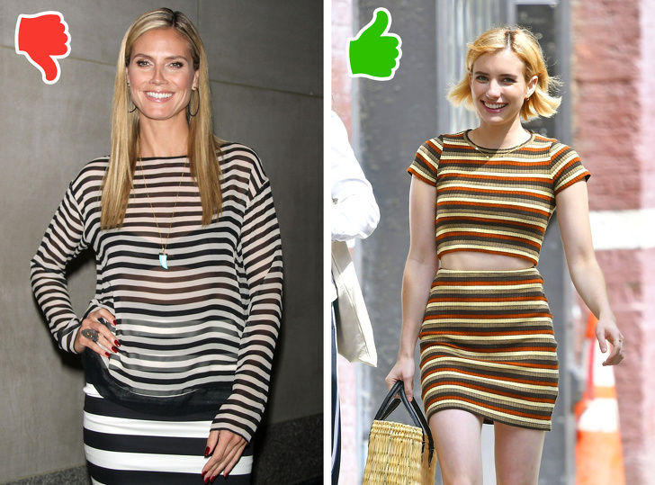Вибирайте рівні смуги однієї ширини. Тонкі смужки виграшніше виглядають на одяг по фігурі, а широкі більш доречні на речах oversize. Колір же варто вибирати, виходячи з того, які відтінки краще поєднуються один з одним і йдуть саме вам.