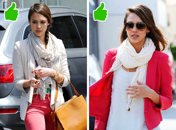 Шарф — така ж важлива частина образу, як сумочка або туфлі, а тому не варто забувати про нього. Можна вибрати легкий шовковий хустку і пов'язати його на шиї: це додасть вам елегантності та жіночності. Або вибрати більш великий і щільний шарф з бавовни або шифону, який додасть образу трохи затишку і тепла.