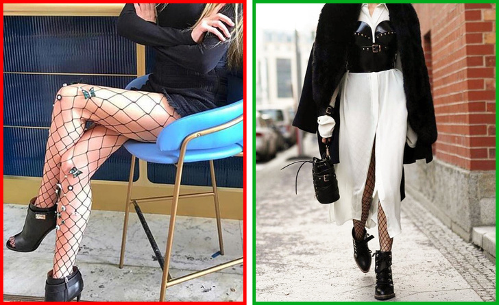 Колготки в сіточку або зі швом ззаду потрібні для створення по-справжньому елегантних образів. Ні в якому разі не надягайте їх з міні-спідницею, відвертою сукнею, відкритій або надто грубими черевиками.