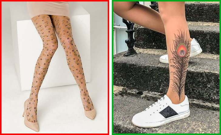 Тілесні колготки з візерунками краще не купувати. В реальності малюнок по всій їх довжині створить враження, що ваші ноги покриті синцями та саднами. З'явилися нещодавно тілесні колготки з імітацією татуювання виглядають дуже ефектно, якщо вибрати малюнок правильних пропорцій.