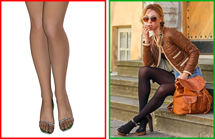 У холодну пору року прозорий капрон не додасть вам шарму, до того ж ви можете застудитися. Якщо на вулиці ви плануєте бути не більше пари хвилин — добігти від будинку до машини, від машини до роботи і т. д. — можете дозволити собі надіти колготки щільністю 20 DEN. Якщо ранньою восени або пізньою весною на вулиці пригріває сонце, і не так вже холодно, не надягайте щільні чорні колготки.