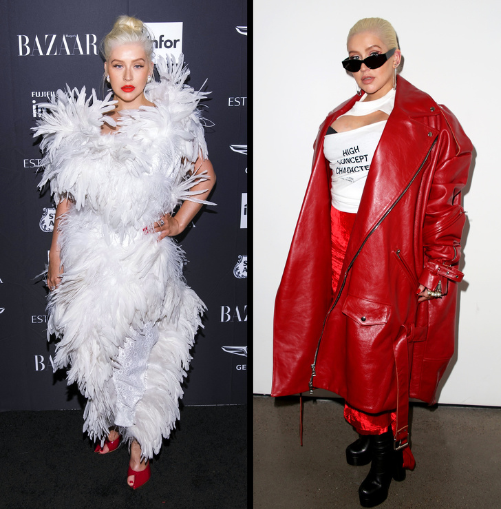Співачка завжди любила експериментувати з образами, але деколи це переходить всі межі. Хоча варто визнати, що сукні з численними пір'ям виглядає не так дивно, як комплект з оксамитової спідниці, об'ємного плаща, майки, чорного бюстгальтера і чобіт в стилі 90-х.