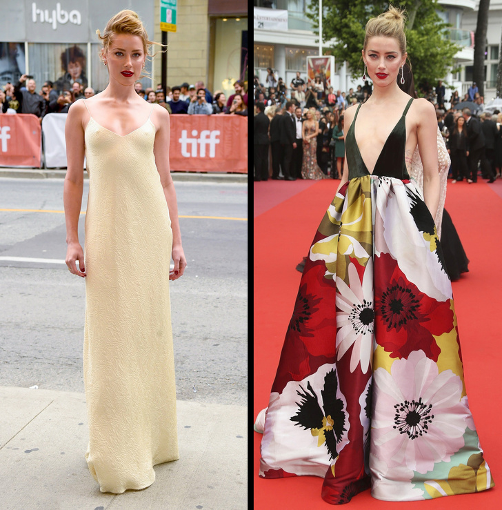 Як ніби хтось навмисно намагається виставити фатальну красуню в невдалому світлі: плаття, яке невигідно підкреслює колір її шкіри, або сміливий V-подібний виріз. У другому образі «постаралися» і візажисти: Ембер виглядає втомленою і навіть заплакана через страз на нижньому столітті.