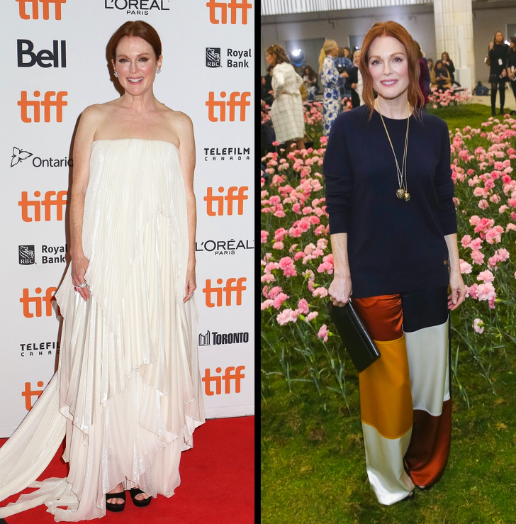 І стилісти Джуліанни Мур вже двічі помилилися в 2018 році: вони приховують актрису за безформними силуетами і зовсім не намагаються підкреслити достоїнства її фігури.
