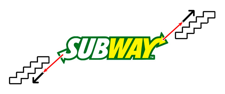 Стрілки на першій та останній букви логотипу мережі швидкого харчування Subway з'явилися не просто так: вони позначають вхід в метро і вихід з нього. Таким чином компанія вирішила показати, що з Subway ви можете їсти на ходу. Не останню роль в логотипі грає і колірна палітра: зелений колір символізує те, що компанія виступає за здорове харчування і постачає відповідну продукцію, а жовтий означає радість, одержувану від життя, оптимізм і веселощі.