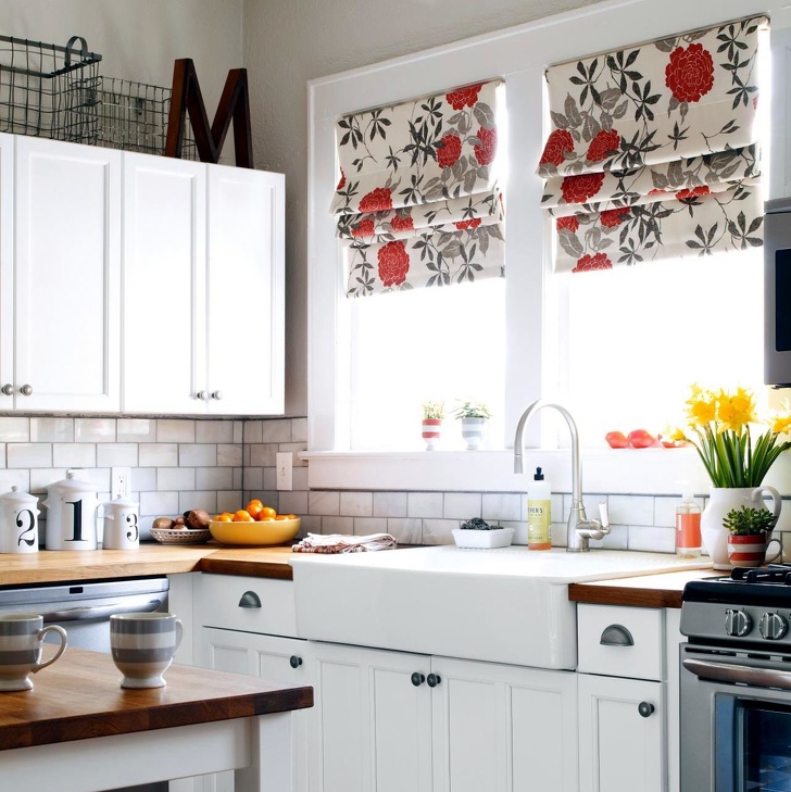 Червоно-біле поєднання плюс рослинний малюнок на шторах — класика, яка тим не менш може додати фарб у вашу кухню.