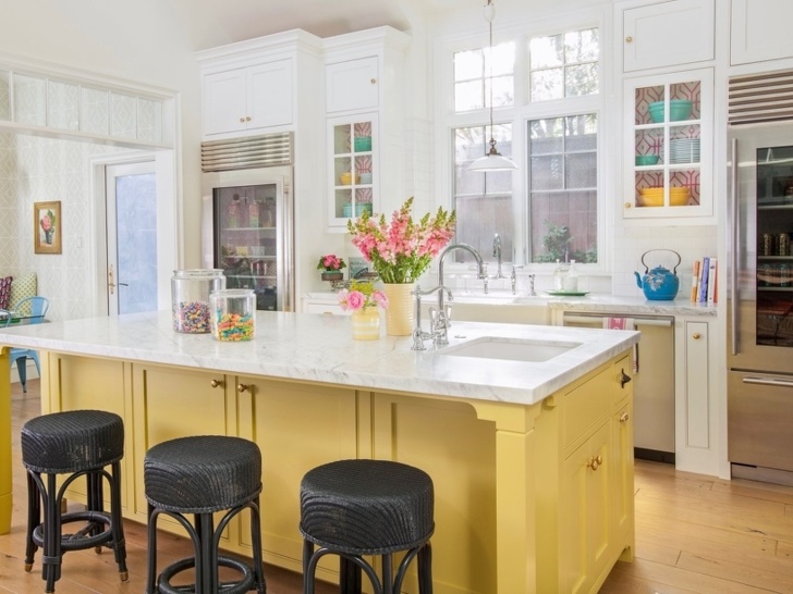 Острів ніжного жовтого кольору робить кухню не тільки комфортною, але і додає в неї світла і позитиву.