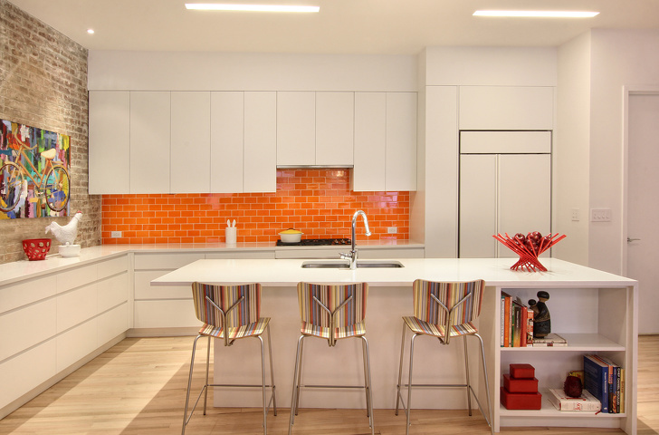 Оранжевий часто використовується як головний акцентний колір в кухнях стилю модерн. І не даремно, адже він буквально вдихає життя і енергію в нудну бежеву палітру.