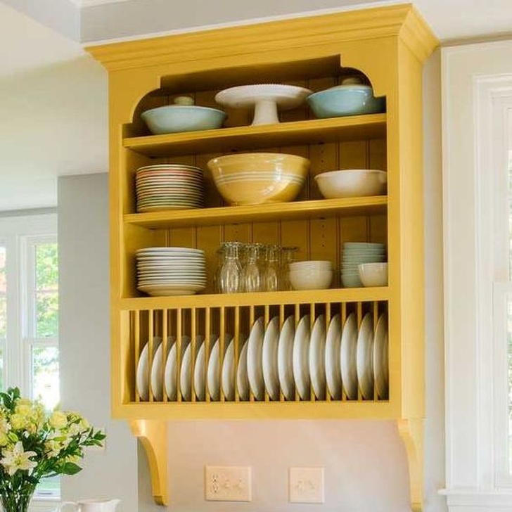 Відкритий шафа для посуду — це не тільки зручно, але, якщо він жовтого кольору, ще й дуже оригінально.