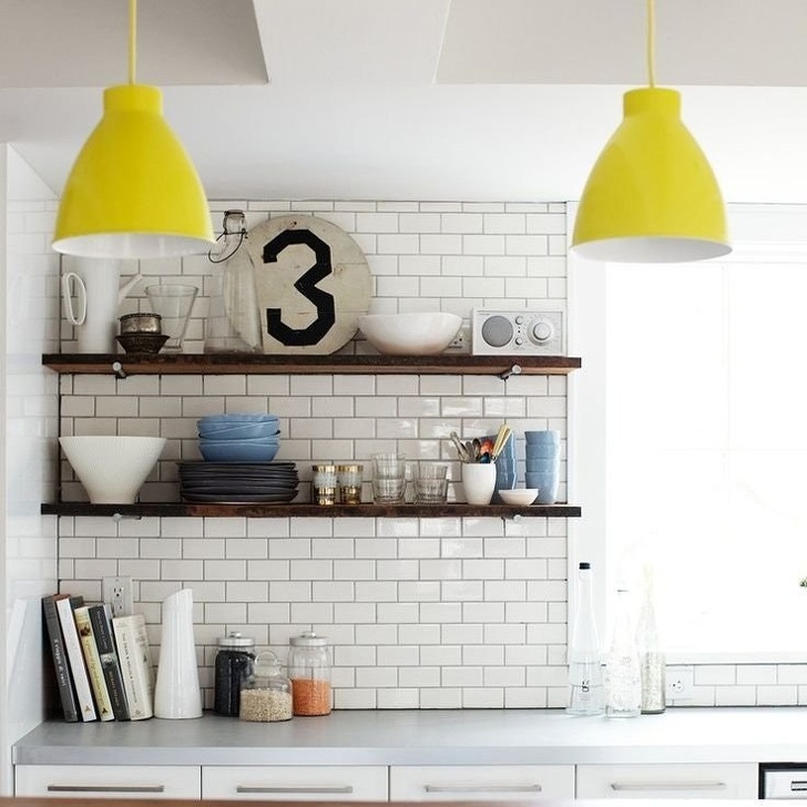 Жовтий колір на кухні завжди доречний: він дуже соковитий і «смачний». Якщо у вас біла кухня, варто спробувати поєднання з натуральним деревом і яскраво-жовтими світильниками.