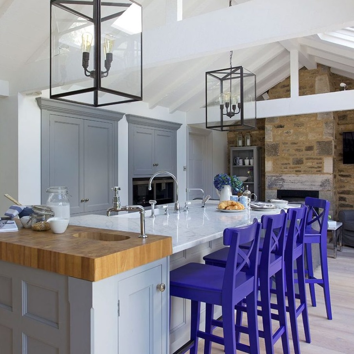 Ще один спосіб додати кольору в кухонний інтер'єр — вибрати стільці насиченого лавандового відтінку.
