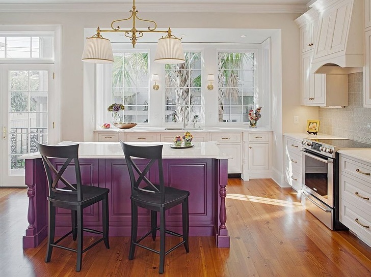 Шикарний острів насиченого сливового відтінку є центром класичній білій кухні і, безсумнівно, привертає до себе увагу.