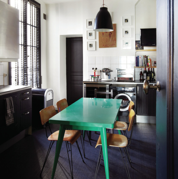 Яскравий зелений колір вигідно відтіняє кухню в темних тонах французького дизайнера Сари Лавуан.