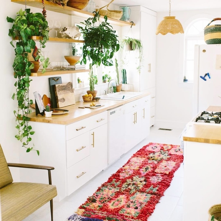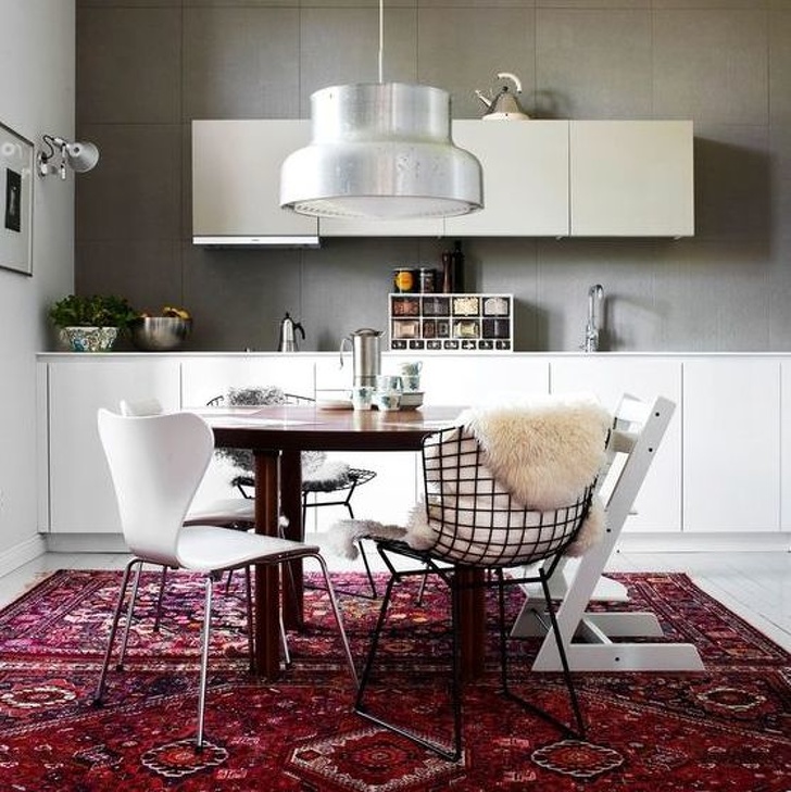 Яскравий килим з довгим ворсом створює затишок в суворій білому інтер'єрі кухні. Так і хочеться по ньому пройтися.