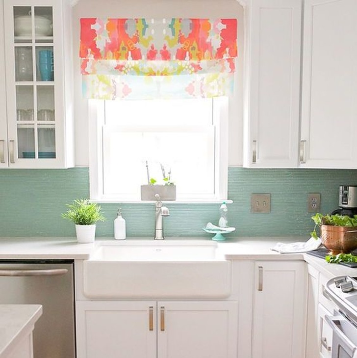 Штори з «акварельними» візерунком гармонійно поєднуються з ніжним світло-бірюзовим відтінком кухонних плитки. Подивитися кухню до і після можна тут.
