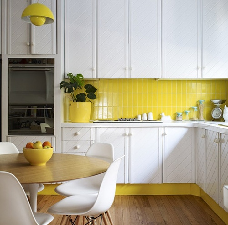 Поєднання лимонно-жовтого і білого особливо підходить невеликим кухонь, так як світлі відтінки візуально розширюють простір, а яскраві кольори створюють об'єм.